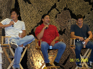 caitlin and i waiting for one of the q and As and poseing with the posters vampires and werewolfs oh my